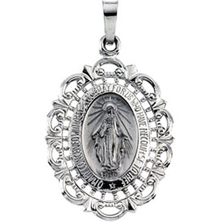 This charming miraculous medal will be appreciated for many years to come. Worn as a symbol of hope and faith for many person of faith, this miraculous medal is made of 14k white gold and measures approximately 18 x 25mm. This miraculous medal in 14k white gold is a wardrobe essential for any devout Christian and comes with a religious design that is simply the best....